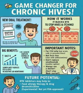 For years, patients with chronic spontaneous urticaria (CSU) who didn’t respond to antihistamines had only injections as the next step. On September 30, 2025, the U.S. Food and Drug Administration (FDA) approved remibrutinib (brand name Rhapsido), the first oral BTK inhibitor for adults with CSU. This approval offers patients — and doctors — the first convenient oral option beyond antihistamines. What Is Chronic Spontaneous Urticaria (CSU)? Why an Oral Option Matters Until now, patients had only these alternatives: Patients have long asked for a safe oral treatment that avoids injections…
